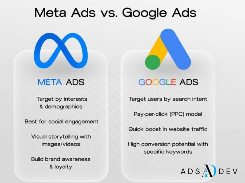 Google Ads appear in search results based on user keywords, while Meta Ads (Facebook & Instagram) reach audiences through interest and behavior targeting.